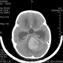 La tomodensitométrie du cerveau montre généralement une masse tissulaire qui peut être améliorée par l'un ou l'autre contraste. Au scanner, les gliomes de bas grade apparaissent généralement isodenses au parenchyme normal et peuvent donc ne pas présenter de rehaussement de contraste. De même, les lésions de la fosse crânienne postérieure sont difficiles à identifier au scanner. Par conséquent, les seuls résultats d'une telle tomographie ne sont pas toujours suffisants à des fins diagnostiques. Dans les cas douteux, l'utilisation de l'imagerie par résonance magnétique plus sensible est indispensable.