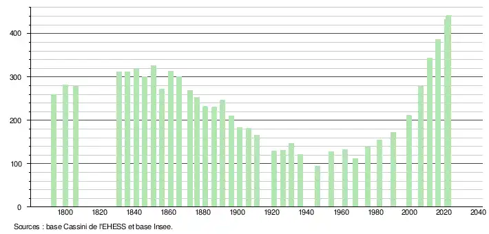 L'évolution du nombre d'habitants est connue à travers les recensements de la population effectués dans la commune depuis 1793. Pour les communes de moins de 10 000 habitants, une enquête de recensement portant sur toute la population est réalisée tous les cinq ans, les populations de référence des années intermédiaires étant quant à elles estimées par interpolation ou extrapolation[16]. Pour la commune, le premier recensement exhaustif entrant dans le cadre du nouveau dispositif a été réalisé en 2006[17].