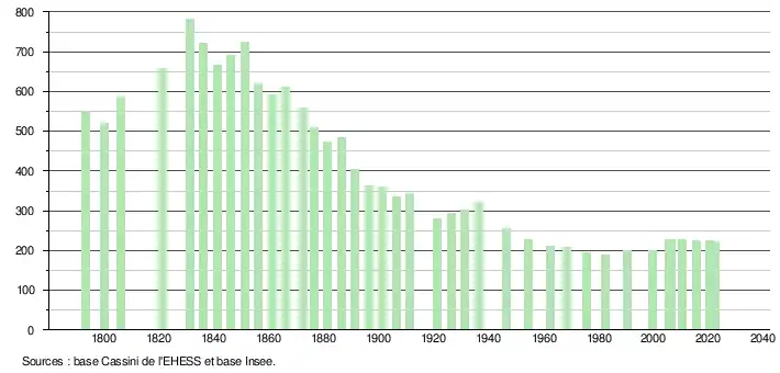 L'évolution du nombre d'habitants est connue à travers les recensements de la population effectués dans la commune depuis 1793. Pour les communes de moins de 10 000 habitants, une enquête de recensement portant sur toute la population est réalisée tous les cinq ans, les populations de référence des années intermédiaires étant quant à elles estimées par interpolation ou extrapolation[16]. Pour la commune, le premier recensement exhaustif entrant dans le cadre du nouveau dispositif a été réalisé en 2005[17].