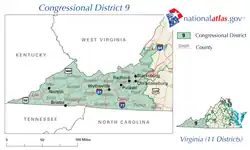 Le 9e district congressionnel de Virginie est un district situé dans le Commonwealth de Virginie et couvrant une grande partie du sud-ouest de l'État. Le 9e est le deuxième plus grand district de Virginie en termes de superficie, couvrant 9 113,87 mi2 (23 604,81 km2)[1],[2] (légèrement plus grand que l'ensemble de l'État du New Jersey). Il est représenté par le Républicain Morgan Griffith depuis 2011. Il a pris ses fonctions après avoir battu le Démocrate sortant Rick Boucher, qui a exercé 14 mandats[3]. Avec un indice CPVI de R+23, c'est le district le plus Républicain de Virginie[4].