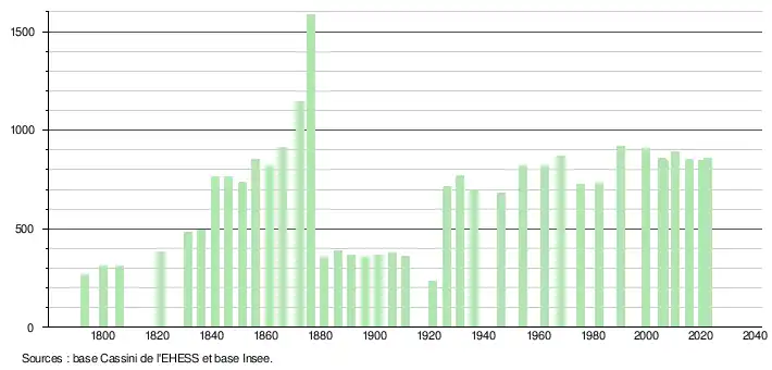 L'évolution du nombre d'habitants est connue à travers les recensements de la population effectués dans la commune depuis 1793. Pour les communes de moins de 10 000 habitants, une enquête de recensement portant sur toute la population est réalisée tous les cinq ans, les populations de référence des années intermédiaires étant quant à elles estimées par interpolation ou extrapolation[26]. Pour la commune, le premier recensement exhaustif entrant dans le cadre du nouveau dispositif a été réalisé en 2005[27].