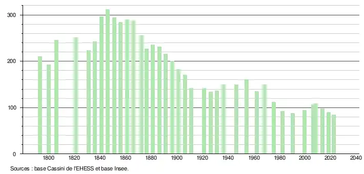 L'évolution du nombre d'habitants est connue à travers les recensements de la population effectués dans la commune depuis 1793. Pour les communes de moins de 10 000 habitants, une enquête de recensement portant sur toute la population est réalisée tous les cinq ans, les populations de référence des années intermédiaires étant quant à elles estimées par interpolation ou extrapolation[22]. Pour la commune, le premier recensement exhaustif entrant dans le cadre du nouveau dispositif a été réalisé en 2008[23].