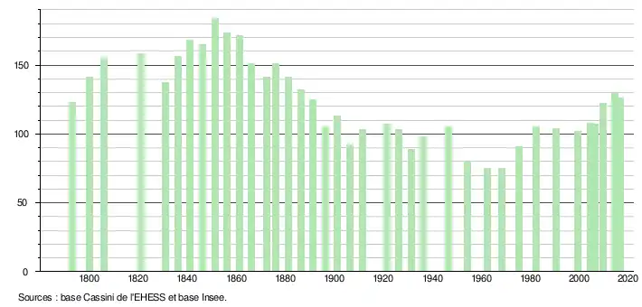 L'évolution du nombre d'habitants est connue à travers les recensements de la population effectués dans la commune depuis 1793. Pour les communes de moins de 10 000 habitants, une enquête de recensement portant sur toute la population est réalisée tous les cinq ans, les populations de référence des années intermédiaires étant quant à elles estimées par interpolation ou extrapolation[15]. Pour la commune, le premier recensement exhaustif entrant dans le cadre du nouveau dispositif a été réalisé en 2004[16].