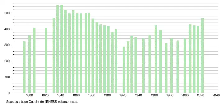 L'évolution du nombre d'habitants est connue à travers les recensements de la population effectués dans la commune depuis 1793. Pour les communes de moins de 10 000 habitants, une enquête de recensement portant sur toute la population est réalisée tous les cinq ans, les populations de référence des années intermédiaires étant quant à elles estimées par interpolation ou extrapolation[26]. Pour la commune, le premier recensement exhaustif entrant dans le cadre du nouveau dispositif a été réalisé en 2006[27].
