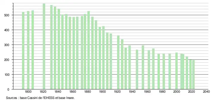 L'évolution du nombre d'habitants est connue à travers les recensements de la population effectués dans la commune depuis 1793. Pour les communes de moins de 10 000 habitants, une enquête de recensement portant sur toute la population est réalisée tous les cinq ans, les populations de référence des années intermédiaires étant quant à elles estimées par interpolation ou extrapolation[13]. Pour la commune, le premier recensement exhaustif entrant dans le cadre du nouveau dispositif a été réalisé en 2008[14].