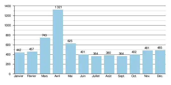 Le débit moyen mensuel observé en mars (minimum d'étiage) est de 364 m3/s, soit plus du quart du débit moyen du mois d'avril (1 321 m3/s), ce qui témoigne de l'amplitude assez modérée des variations saisonnières. Sur la durée d'observation de 170 ans, le débit mensuel minimal a été de 184 m3/s (août 1969), tandis que le débit mensuel maximal s'élevait à 3 310 m3/s (avril 1958). Un débit mensuel inférieur à 200 m3/s est tout à fait exceptionnel.