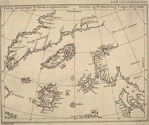 Ces récits controversés ne sont peut-être qu'une invention, ou pas, du descendant des frères Zeno, qui publie en 1558 sous le titre de Dello scoprimento dell' isole Frislanda, Estlanda, Engrouelanda, Estotilanda e Icaria fatto sotto il Polo artico, da' due fratelli Zeni, M. Nicolo il K. e M. Antonio (sur la découverte des îles Frislande, Estlande, Engrouelande, Estotilande et Icare fait sous le pôle Arctique, par les frères Zeni, maître Nicolo et maître Antonio), une saga censée s'être déroulée environ 170 ans plus tôt, à la fin du XIV°siècle.