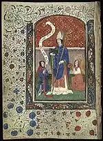 | Attributs | Crosse, livre et maquette d'une église blanche |