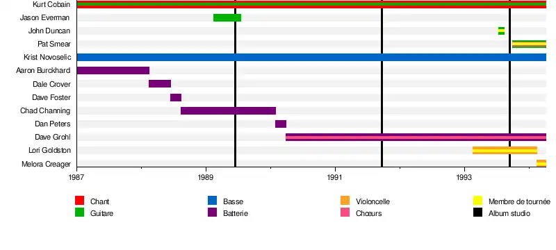 Nirvana ([nɪɹˈvɑnə][4] ) est un groupe de grunge américain, originaire d'Aberdeen, dans l'État de Washington, formé en 1987 par le chanteur-guitariste Kurt Cobain et le bassiste Krist Novoselic. Après Bleach en 1989, leur premier album studio produit par le label indépendant Sub Pop et une succession de batteurs, la formation se stabilise avec l'arrivée de Dave Grohl en octobre 1990.