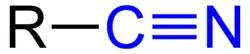 Le groupement nitrile correspond à ≡N (-C≡N est le groupe cyano ou carbonitrile[1]) et les règles IUPAC de dénomination des nitriles[2] sont claires : par exemple,