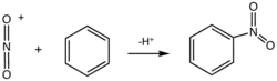 Le cation nitronium obtenu réagit avec le benzène par substitution électrophile aromatique :