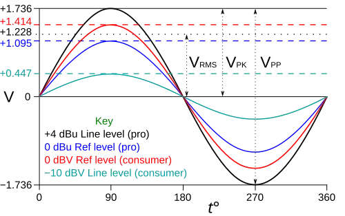- pour le niveau ligne grand public, l'amplitude du signal de référence est de 1,414 V, soit une tension efficace de 1 V pour un signal sinusoïdal pur ; le niveau ligne est défini comme étant à −10 dB par rapport à ce niveau de référence, ce que l'on note −10 dBV (decibel volts).