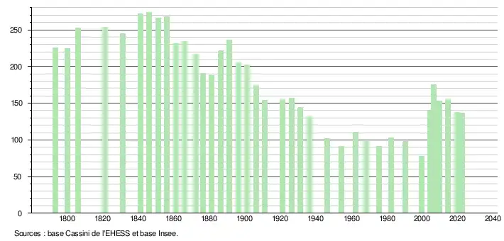L'évolution du nombre d'habitants est connue à travers les recensements de la population effectués dans la commune depuis 1793. Pour les communes de moins de 10 000 habitants, une enquête de recensement portant sur toute la population est réalisée tous les cinq ans, les populations de référence des années intermédiaires étant quant à elles estimées par interpolation ou extrapolation[27]. Pour la commune, le premier recensement exhaustif entrant dans le cadre du nouveau dispositif a été réalisé en 2004[28].
