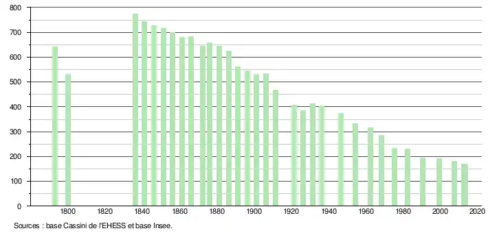- ↑ Par convention dans Wikipédia, le principe a été retenu de n’afficher dans le tableau des recensements et le graphique, pour les populations légales postérieures à 1999, que les populations correspondant à une enquête exhaustive de recensement pour les communes de moins de 10 000 habitants, et que les populations des années 2006, 2011, 2016, etc. pour les communes de plus de 10 000 habitants, ainsi que la dernière population légale publiée par l’Insee pour l'ensemble des communes.