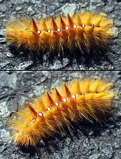 La chenille est très reconnaissable à ses couleurs vives. Elle est jaune orange à tête brune, poilue, munie de 4 paires de touffes de poils orange et recouverte sur le dessus d'une ligne médiane de petits losanges blancs bordés de noir. Elle mesure environ 40 mm et se nourrit de feuilles d'érables, de marronniers, de chênes dont Quercus robur, de tilleuls, de saules dont Salix caprea ou de noisetier (Corylus avellana).