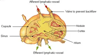 - le hile, au niveau duquel il y a autant de lymphocytes B que de lymphocytes T, et par lequel sort le vaisseau lymphatique efférent.