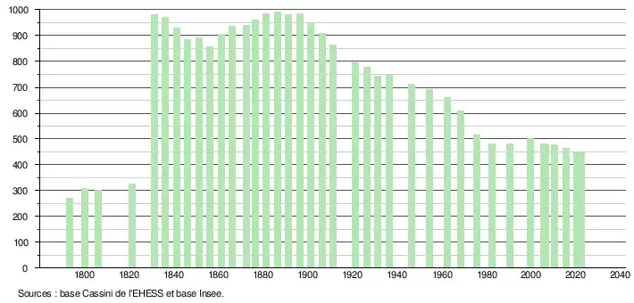 L'évolution du nombre d'habitants est connue à travers les recensements de la population effectués dans la commune depuis 1793. Pour les communes de moins de 10 000 habitants, une enquête de recensement portant sur toute la population est réalisée tous les cinq ans, les populations de référence des années intermédiaires étant quant à elles estimées par interpolation ou extrapolation[41]. Pour la commune, le premier recensement exhaustif entrant dans le cadre du nouveau dispositif a été réalisé en 2005[42].