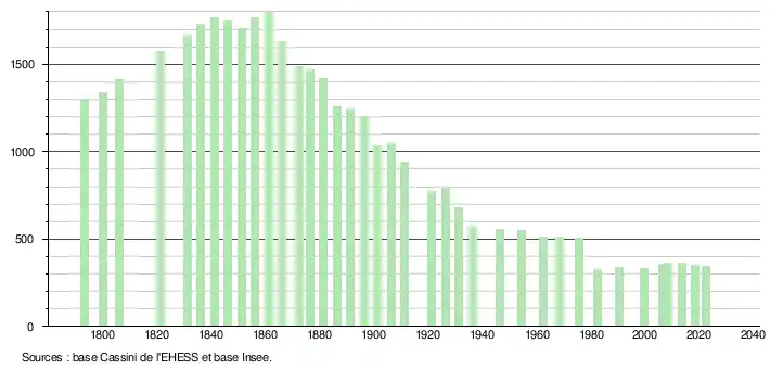 L'évolution du nombre d'habitants est connue à travers les recensements de la population effectués dans la commune depuis 1793. Pour les communes de moins de 10 000 habitants, une enquête de recensement portant sur toute la population est réalisée tous les cinq ans, les populations de référence des années intermédiaires étant quant à elles estimées par interpolation ou extrapolation[28]. Pour la commune, le premier recensement exhaustif entrant dans le cadre du nouveau dispositif a été réalisé en 2008[29].