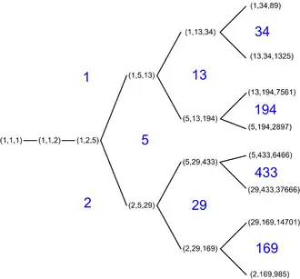 Plus précisément, les triplets de Markov normalisés peuvent être disposés en un arbre binaire infini : les voisins d'un triplet normalisé sont obtenus en modifiant comme ci-dessus l'une des trois coordonnées, puis en renormalisant le triplet obtenu. Les nombres de Markov apparaissant au bord de la région 1 (voir figure), appartenant à un triplet de premier terme 1, sont les nombres de Fibonacci d'indices impairs (
