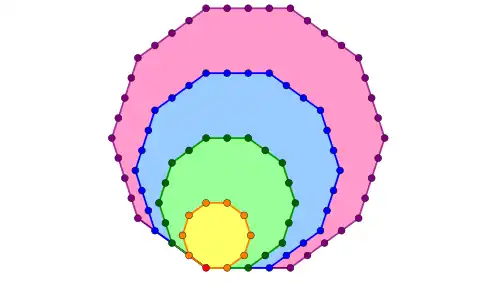 La méthode pour passer d'un polygone au suivant consiste à prolonger d'un seul point chacun des deux côtés adjacents à un seul sommet, puis à compléter la figure par des points pour obtenir les côtés supplémentaires manquants. Dans les diagrammes ci-dessous, chaque couche supplémentaire est représentée par des points rouges. Pour tout entier k ≥ 3, par convention, posons Pk,0 = 0 ; pour tout entier n ≥ 1, le nombre de points rouges du n-ième k-gone, possédant points sur chaque arête, est égal à (points disposés aux sommets) plus (points disposés à l'intérieur des arêtes). Donc :
