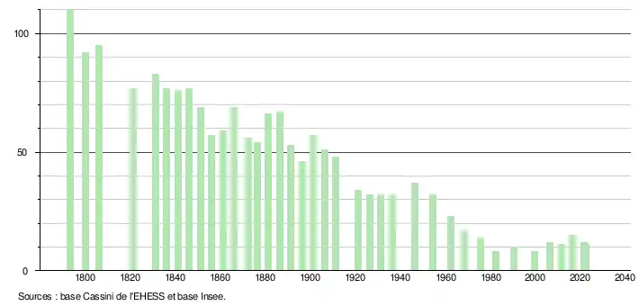 L'évolution du nombre d'habitants est connue à travers les recensements de la population effectués dans la commune depuis 1793. Pour les communes de moins de 10 000 habitants, une enquête de recensement portant sur toute la population est réalisée tous les cinq ans, les populations de référence des années intermédiaires étant quant à elles estimées par interpolation ou extrapolation[16]. Pour la commune, le premier recensement exhaustif entrant dans le cadre du nouveau dispositif a été réalisé en 2006[17].