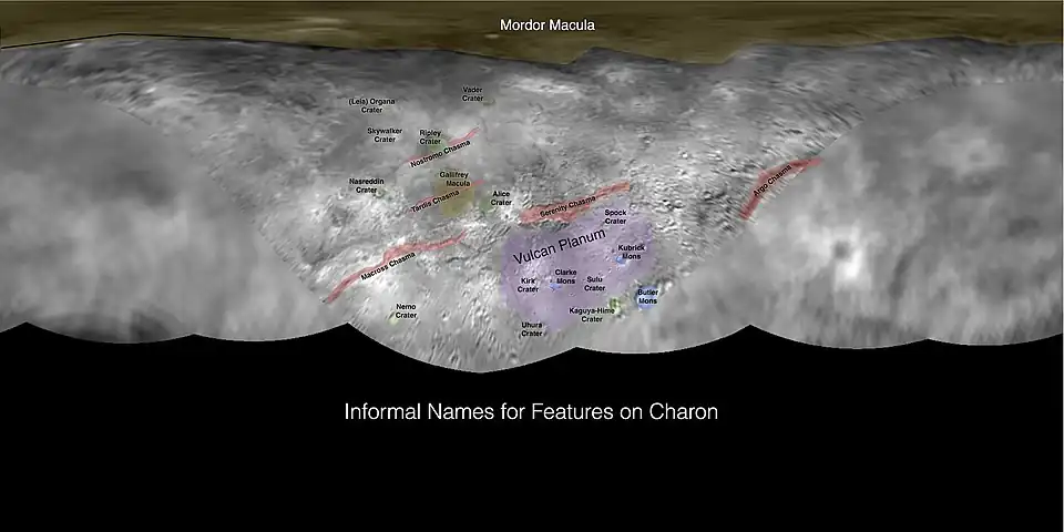 Carte de Charon. Le chasma Nostromo est représenté par un tracé rouge sous le cratère Ripley.