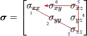 Cette matrice contient 9 coefficients dont 6 seulement sont indépendants. La donnée de ces 6 coefficients suffit donc à représenter complètement le tenseur. On va donc rassembler les deux indices en un seul suivant la convention :