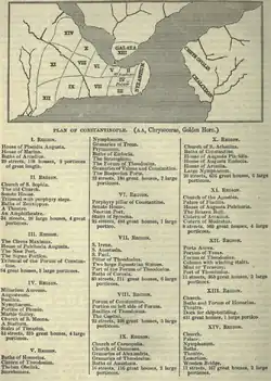 - Région III : l'hippodrome de Constantinople, le Nouveau Port (Kontoskalion), un bâtiment semi-circulaire appelé Sigma (près du Konstoskalion), le tribunal du forum de Constantin, quatre-vingt-quatorze « domus ».