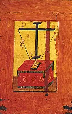L'iconographie de la préparation du trône (en grec: hétimassia / ἑτοιμασία) est liée à des conceptions antiques du trône-tabernacle de l'empereur considéré comme un dieu. Ce trône est symbolisé par l'autel recouvert d'une nappe bordée d'une bande bleu foncé. À Byzance, au XIe siècle, les instruments de la Passion du Christ sont ajoutés à l'autel : la couronne d'épines à droite et les quatre clous à gauche. Dressées derrière l'autel, à gauche, une lance et, à droite, une longue branche droite, avec au-dessus l'éponge de vinaigre, qui complètent la composition[4]. Une colombe est posée sur l'évangéliaire. L'ensemble forme une symbolisation concentrée et stylisée du sacrifice du Christ sur la croix[5].