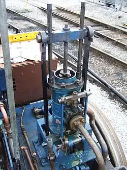 L'eau était mise en charge grâce à une pompe en dérivation de l'un des pistons (comme c'était pratique courante l'époque).