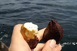La coque est divisée intérieurement en 4 loges, qui renferment chacune plusieurs graines trigones aux arêtes vives, de 35 mm de long, de section triangulaire. Leur nombre au total varie de 18 et 23 selon la grosseur de la coque. Chaque graine est protégée par un tégument brun-noir, dur, ligneux et rugueux. L’amande est blanche, huileuse et un excellent comestible. Les cotylédons sont réduits à deux minuscules écailles.