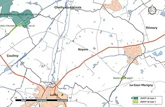 | « Canal d'Orléans du Hateau à la vallée » | type 1[Note 1] | 4 hectares | S'étend sur 3 communes (Chailly-en-Gâtinais, Coudroy et Noyers). Il s'agit d'une portion du canal d'Orléans, située entre l'écluse de la Vallée et l'écluse du Hateau[DREAL 1]. Son altitude est de 100 m[INPN 2]. Le site abrite une population très importante d'Hydrocharis morsus-ranae, espèce rare en région Centre-Val de Loire. C'est donc ici le nombre particulièrement important (une des plus belles populations de la région, voire la plus belle) d'individus qui motive la reconnaissance du site en ZNIEFF de type 1[INPN 3].