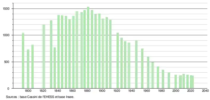 L'évolution du nombre d'habitants est connue à travers les recensements de la population effectués dans la commune depuis 1793. Pour les communes de moins de 10 000 habitants, une enquête de recensement portant sur toute la population est réalisée tous les cinq ans, les populations de référence des années intermédiaires étant quant à elles estimées par interpolation ou extrapolation[17]. Pour la commune, le premier recensement exhaustif entrant dans le cadre du nouveau dispositif a été réalisé en 2005[18].
