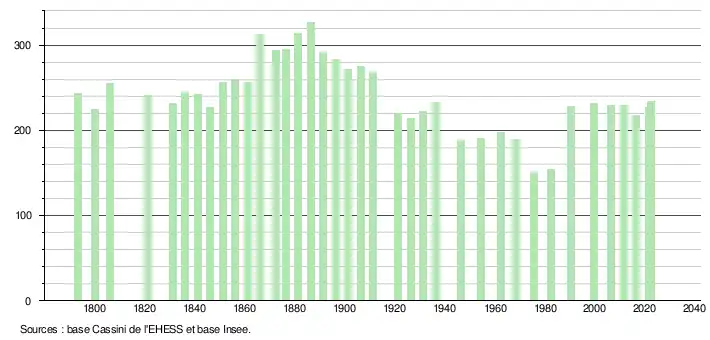 L'évolution du nombre d'habitants est connue à travers les recensements de la population effectués dans la commune depuis 1793. Pour les communes de moins de 10 000 habitants, une enquête de recensement portant sur toute la population est réalisée tous les cinq ans, les populations de référence des années intermédiaires étant quant à elles estimées par interpolation ou extrapolation[22]. Pour la commune, le premier recensement exhaustif entrant dans le cadre du nouveau dispositif a été réalisé en 2006[23].