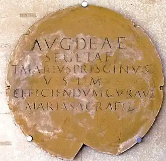 - ↑ Segeta (‘Victory’), thèse universitaire Lyon II. Inscription complétée : Aug(ustae) deae Segetae T(itus) Marius Priscinus v(otum) s(olvit) l(ibens) m(erito) efficiendum curau(i)t Maria Sacra fil(ia). Le donateur porte le tria nomina (trois noms) des citoyens de Rome ; et sa fille porte des noms latins.