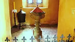 En entrant dans l'église sous l'ancien porche, on trouve deux anciens baptistères qui pourraient avoir fait partie de la première époque de l'église au XIIIe siècle. L'un des deux est un font baptismal en grès gris dont la une cuve est remontée sur un pied qui pourrait date de 1717.