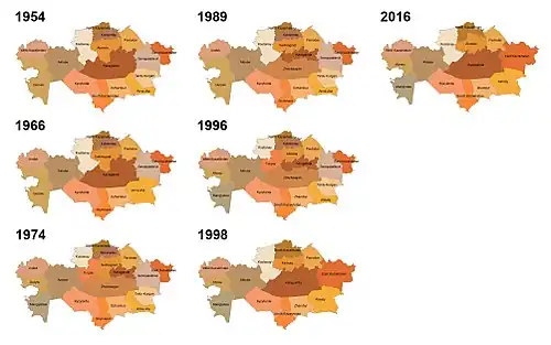 La république du Kazakhstan est subdivisée en 20 entité administratives majeures, dont 17 provinces (en kazakh : облыстар (oblystar) au pluriel, облыс (oblys) au singulier / en russe : области (oblasti) au pluriel, область (oblast') au singulier)[1]. Chaque province est subdivisée en districts (en kazakh : аудандар (audandar) au pluriel, аудан (audan) au singulier / en russe : районы (raïoni) au pluriel, район (raïon) au singulier).