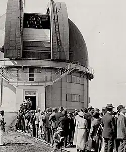 L'inauguration eut lieu le 31 mai 1935, jour anniversaire des 70 ans de Chant : l'astronome royal Frank Dyson et l'ex-Premier Ministre William Lyon Mackenzie King, prononcèrent un discours lors de la cérémonie. Chant annonça sa retraite et déménagea dans une ancienne ferme annexée à l'observatoire, construite en 1864 pour Alexander Marsh[7] au sud des locaux administratifs. Au mois de mai 1939, le train qui emmenait le roi George VI et la reine-mère Elisabeth pour leur tour protocolaire du Canada s'arrêta à la gare voisine pour permettre la visite du plus grand télescope du commonwealth[8].