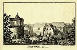 Le nouveau bâtiment de l'observatoire, construit entre 1803 et 1816, se trouvait à l'extérieur des murs de la ville, sur la voie menant à Geismar (aujourd'hui Geismar Landstraße 11). Sa construction, sur un terrain en légère pente ascendante vers le nord, est financée par le roi anglo-hanovrien George III. Son architecte en fut le maître d'œuvre universitaire Georg Heinrich Borheck . Retardé par les guerres napoléoniennes, le bâtiment ne put être achevé qu'en 1816 sous l'autorité du directeur des constructions Justus Heinrich Müller[5],[6].
