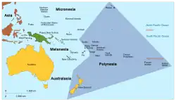 La majorité des groupes d'îles sont plus étroitement alignés sur la Nouvelle-Zélande et l'Australie, tandis que d'autres sont politiquement alignés sur la France ou les États-Unis[50]. Hawaï est géographiquement isolée de la Polynésie et est située dans le Pacifique Nord, contrairement au reste de la Polynésie, qui se trouve dans le Pacifique Sud. Ils font toujours partie de la sous-région pour des raisons ethnoculturelles. L'île de Pâques est située dans une partie reculée du Pacifique, à des milliers de kilomètres de la Polynésie et du continent sud-américain. Il a été annexé par le Chili en 1888, et l'espagnol est désormais couramment parlé de manière bilingue, certains ayant été mêlés à des colons chiliens métis. Cependant, les habitants considèrent leur île et sa culture comme polynésiennes et ne se considèrent pas comme des Sud-Américains[53],[10].