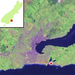Localisation d' ‘Océan Grove’ (marqué par un point rouge) au sein de la ville de Dunedin, les deux lobes du lagon de ‘Tomahawk’ peuvent être clairement vus.