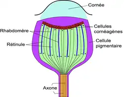 Ce type d'ocelle est constitué d'une cornée (lentille) et d'une couche de cellules photoréceptrices (cellules cornéagènes). La cornée peut être fortement courbée (ex : abeilles, criquets et libellules) ou plate (ex : cafard). Le nombre de cellules photoréceptrices peut varier de quelques centaines à plusieurs milliers.