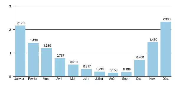 Sur cette période d'observation, le débit journalier maximal a été observé le pour 21,2 m3/s. Le débit instantané maximal a été observé le [note 4] avec 27,0 m3/s en même temps que la hauteur maximale instantanée de 189 cm soit 1,89 m[2].