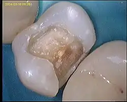 Le dentiste peut également utiliser un laser dentaire (sono-abrasion par ultra-sons) ou des instruments d'air abrasion par sablage (technique utilisée notamment pour traiter les lésions situées entre deux dents), si l'émail des dents à traiter n'est pas trop épais, si la carie est débutante[1], ainsi que des appareils à ozone dans le même cas de figure. L'intervention au laser est généralement plus coûteuse que l'intervention à la fraise.
