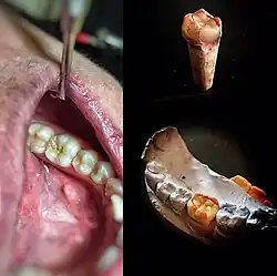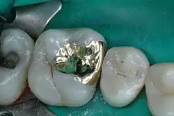 • La technique indirecte consiste à prendre l'empreinte de la cavité que l'on veut obturer, le prothésiste fabrique ensuite la pièce juste manquante. Les matériaux pouvant être utilisés sont : les métaux et alliages métalliques (or, nickel-chrome, chrome-cobalt), la résine cuite, la céramique (ou porcelaine). La pièce issue de cette technique s'appelle un inlay. Quand la cavité est très grosse et que des parties entières de dents sont à reconstruire, on les appelle onlay. Cette technique a comme avantage d'être très pérenne, très satisfaisante esthétiquement (sauf quand le matériau utilisé est métallique), mais extrêmement onéreuse (de 10 à 20 fois le prix d'une restauration par technique directe).