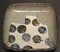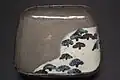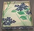 - Plat quadrangulaire (kakuzara) à décor d'iris. Entre 1699 et 1711. Grès, engobe blanche, émaux sous couverte. H 25,3 x L 22,8 x P env. 5 cm[6]