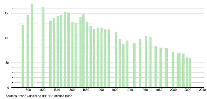 L'évolution du nombre d'habitants est connue à travers les recensements de la population effectués dans la commune depuis 1793. Pour les communes de moins de 10 000 habitants, une enquête de recensement portant sur toute la population est réalisée tous les cinq ans, les populations de référence des années intermédiaires étant quant à elles estimées par interpolation ou extrapolation[19]. Pour la commune, le premier recensement exhaustif entrant dans le cadre du nouveau dispositif a été réalisé en 2008[20].