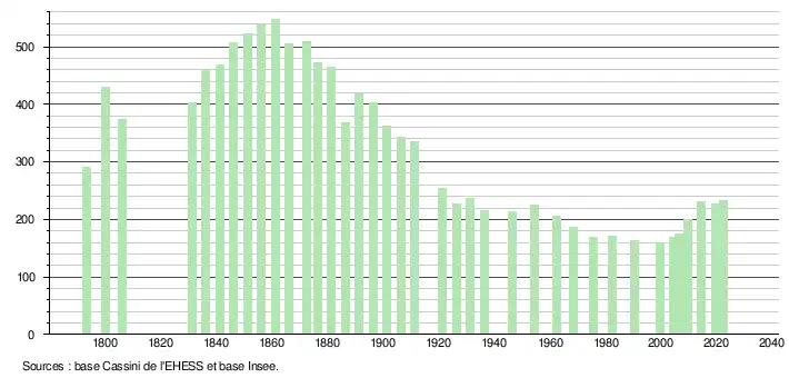 L'évolution du nombre d'habitants est connue à travers les recensements de la population effectués dans la commune depuis 1793. Pour les communes de moins de 10 000 habitants, une enquête de recensement portant sur toute la population est réalisée tous les cinq ans, les populations de référence des années intermédiaires étant quant à elles estimées par interpolation ou extrapolation[28]. Pour la commune, le premier recensement exhaustif entrant dans le cadre du nouveau dispositif a été réalisé en 2004[29].