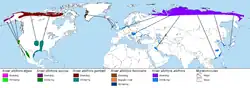 • Anser albifrons gambelli Hartlaub, 1852 — Alaska et nord-ouest, centre-nord du Canada ;