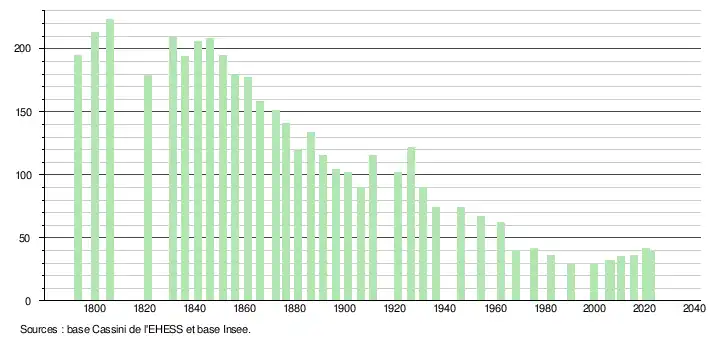 L'évolution du nombre d'habitants est connue à travers les recensements de la population effectués dans la commune depuis 1793. Pour les communes de moins de 10 000 habitants, une enquête de recensement portant sur toute la population est réalisée tous les cinq ans, les populations de référence des années intermédiaires étant quant à elles estimées par interpolation ou extrapolation[13]. Pour la commune, le premier recensement exhaustif entrant dans le cadre du nouveau dispositif a été réalisé en 2005[14].